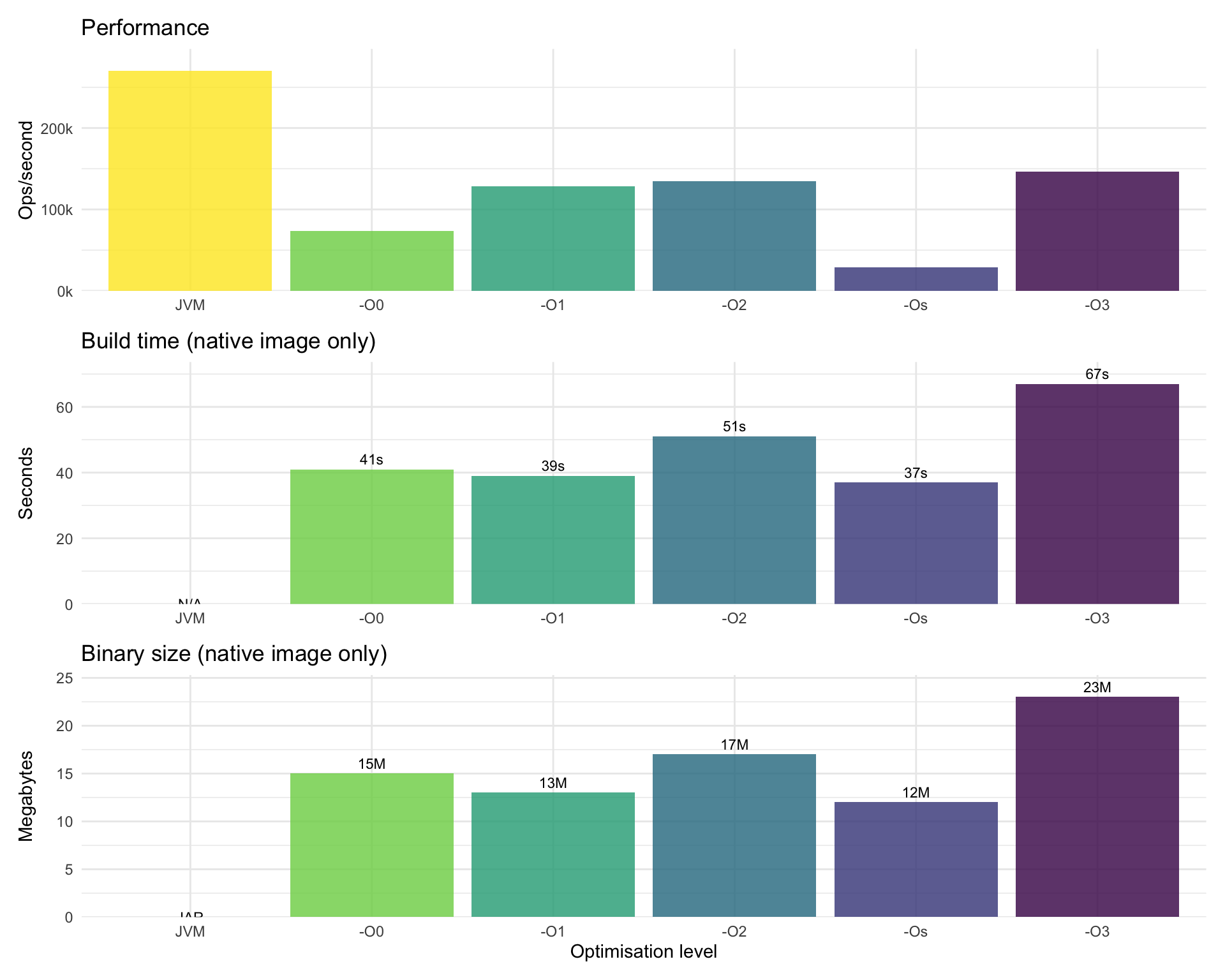 The most striking finding: -Os is not just slower than -O3, it’s by far the slowest of all optimisation levels. This seems a bit counterintuitive, since -Os is supposed to optimise for size while maintaining reasonable performance. Also noteworthy: the JVM (270k ops/s) significantly outperforms even the best native image option (-O3 at 147k ops/s) by 84%.